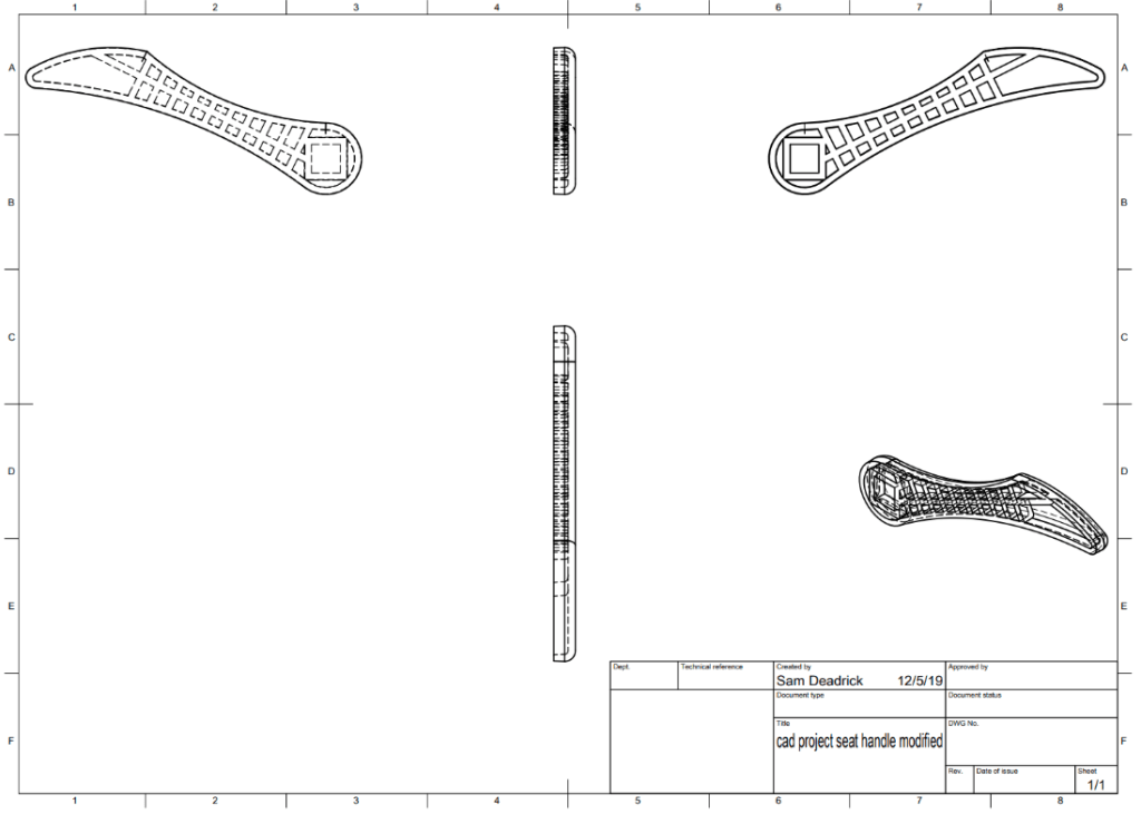 I was responsible for designing the seat handle. My original design for an injection molded handle was made of ABS plastic and had a mass of 10.946g and an FOS of 0.67.